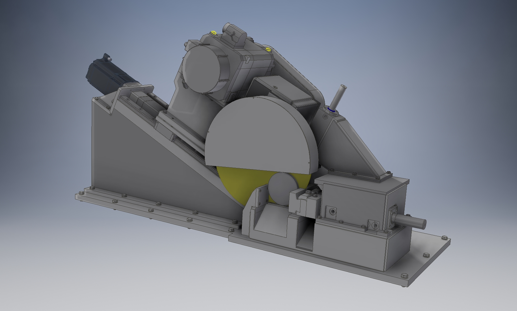 Schrägbettsäge 25° Vollmaterialsäge mit Spannvorrichtung 3D Entwurf für 2 verschiedene Dimensionen mit verschiedenen Sägegetrieben. Konstruktion und Auslegung des Maschinenständers mit der Vorschubeinheit und des Sägegetriebes.