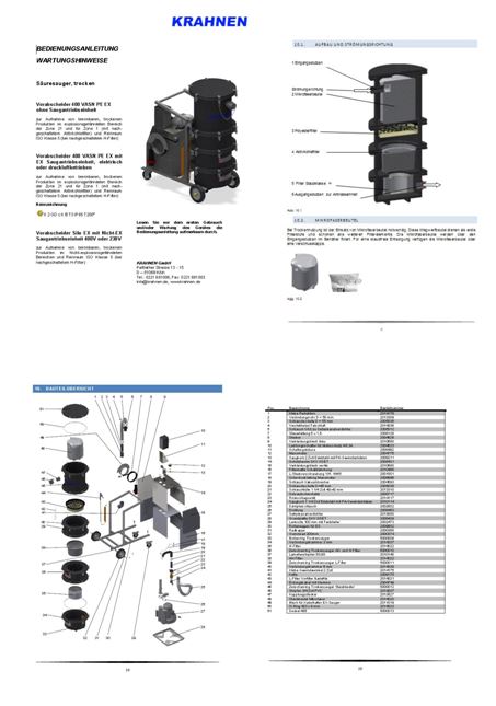 Auf der rechten Seite sehen Sie Auszüge der Bedienungsanleitung eines elektromotorisch betriebenen Säuretrockensaugers. Aus dem aufgenommenen 3-D Modell wurden sämtliche zur Demontage der Filter notwendigen technischen Abläufe bebildert. Neben dem Deckblatt wurde eine Explosionszeichnung mit Stückliste für die Ersatzteilbeschaffung eingefügt.